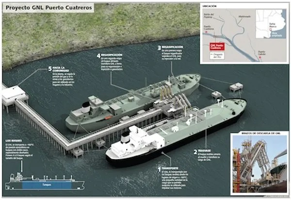 El proyecto GNL Puerto Cuatreros, localidad de Bahía Blanca, consiste en la construcción de una terminal regasificadora de gas natural licuado para alimentar la red energética argentina. Raúl Bertero realizó el análisis probabilístico de la demanda sísmica en el potencial lugar de emplazamiento considerando las distintos epicentros cercanos y lejanos, así como la atenuación y propagación de las ondas en el terreno, proveyendo al cliente los espectros de diseño en base a requisitos de performance.